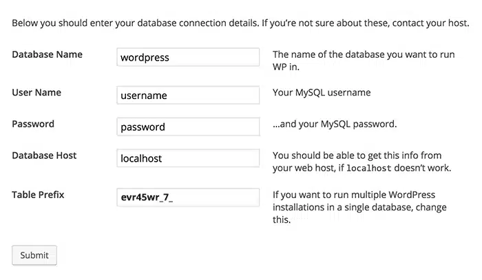 At the bottom of the database connection window you’ll see a Table Prefix field defaulted to wp_. Even though the instructions say, “If you want to run multiple WordPress installations in a single database, change this” change it anyway. I selected evr45wr_7_. Click Submit. Security upgraded in WAAAAY less than 5 minutes.