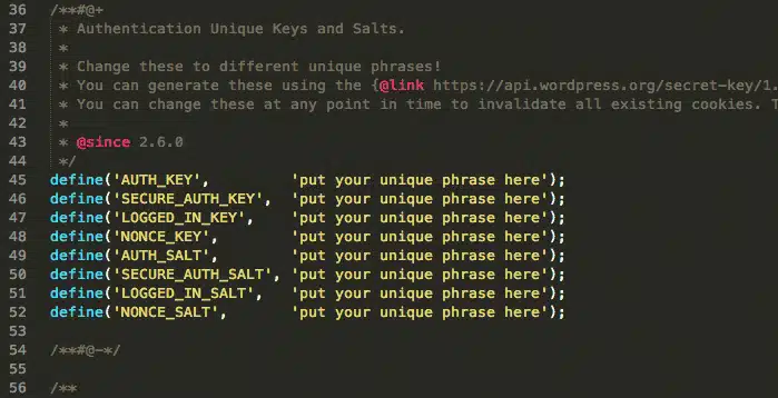 You can dramatically increase the security of your cookies, making them much harder to crack, simply by creating secret keys. Once you create these keys you won’t need to remember or keep track of them making this a pain-free technique and one you can accomplish in 5 minutes. WordPress has four secret keys that you’ll create: AUTH_KEY, SECURE_AUTH_KEY, LOGGED_IN_KEY and NONCE_KEY and 4 SALTS that are optional. Let’s get started.